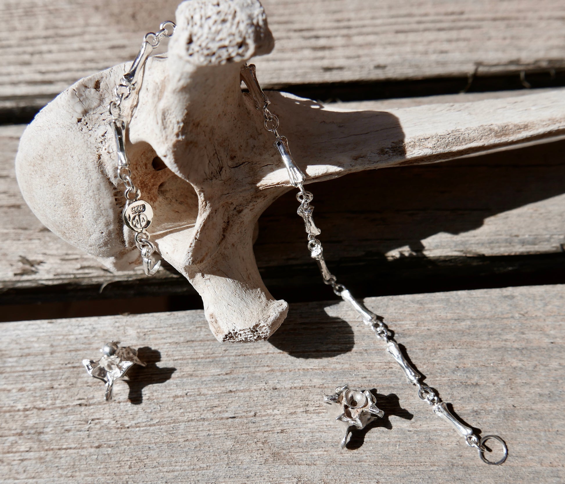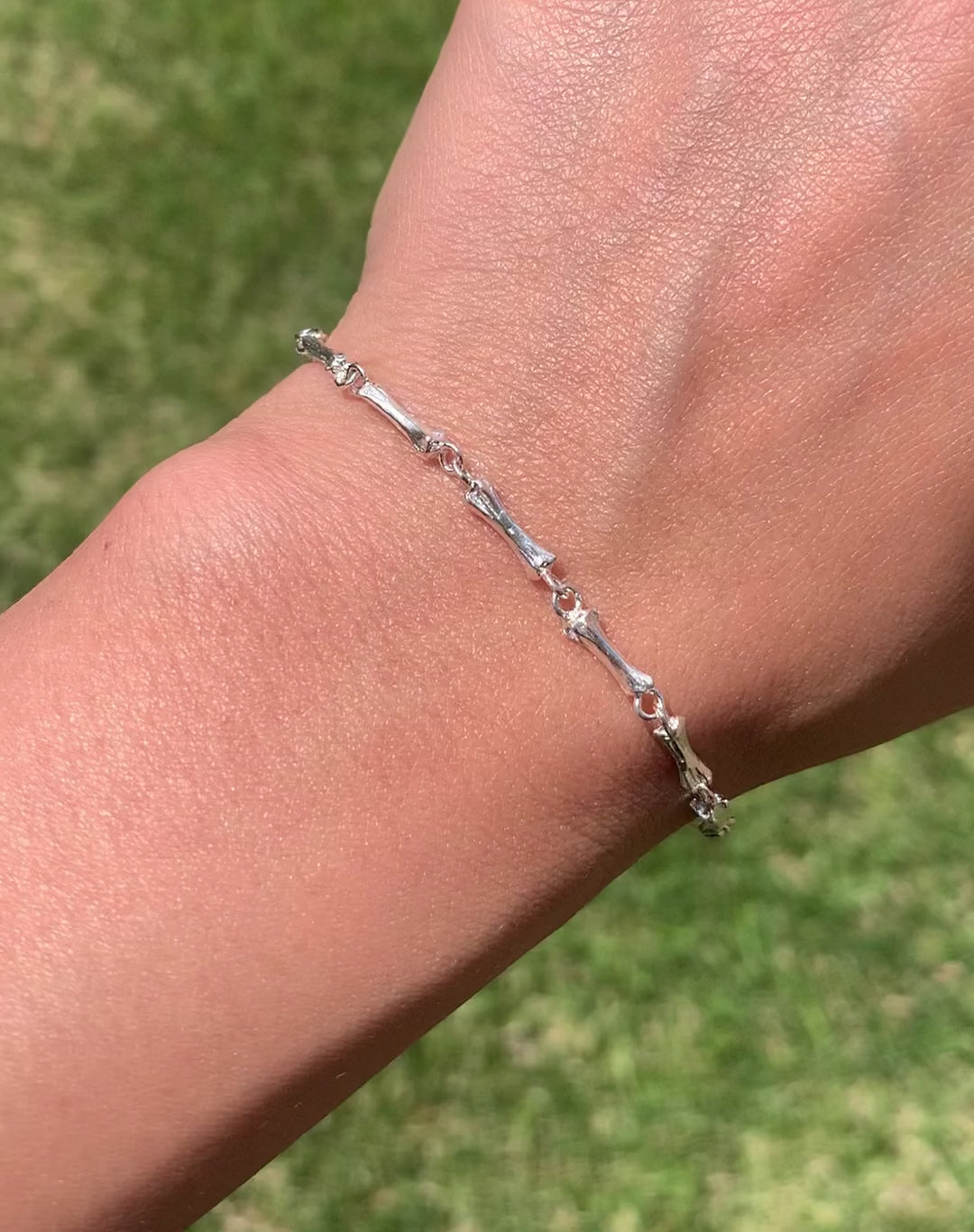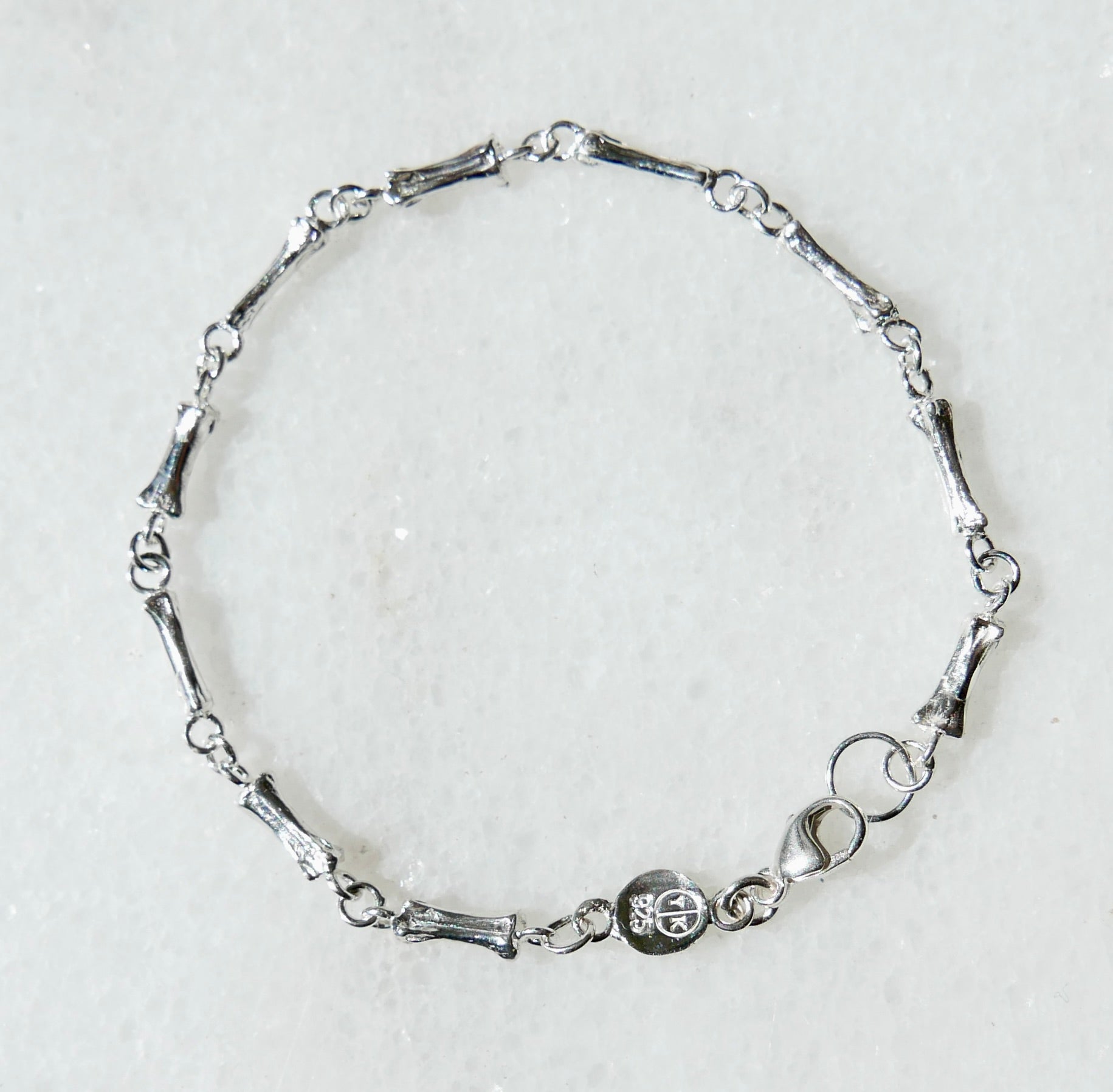 A simple bone chain bracelet. The bones were cast from an actual animal (rabbit tail) bone. All materials are solid sterling silver 925.Available in 6 or 7 inch lengths, or contact me for a custom size.