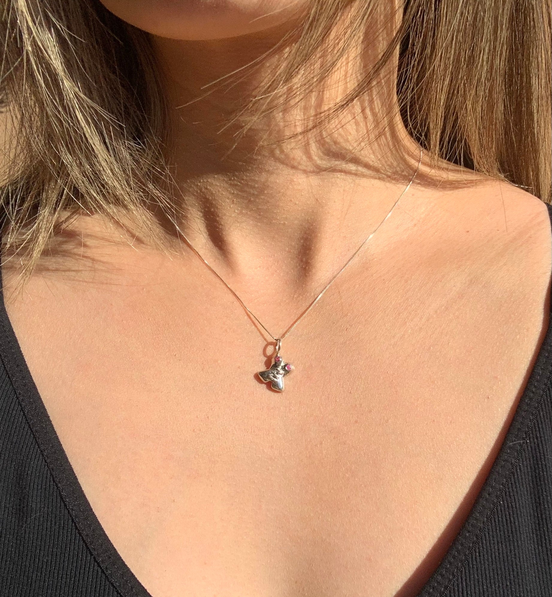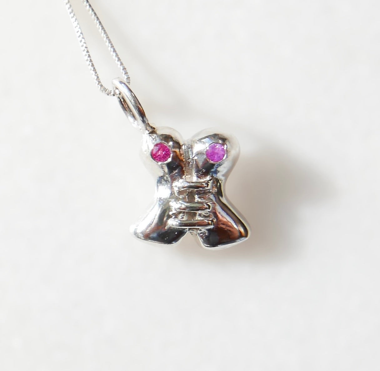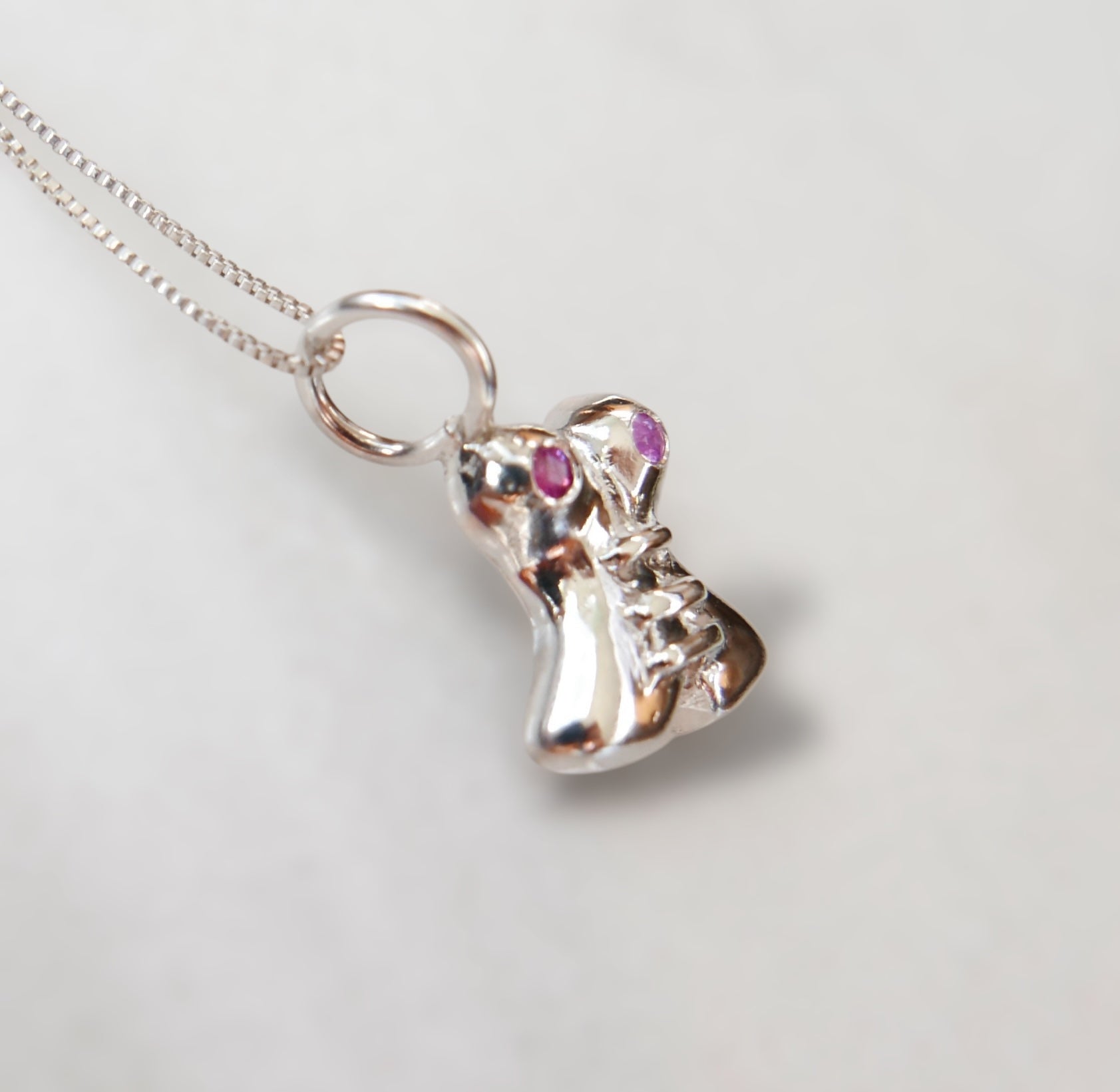 Handcrafted bustier charm necklace with pink sapphires set in sterling silver.