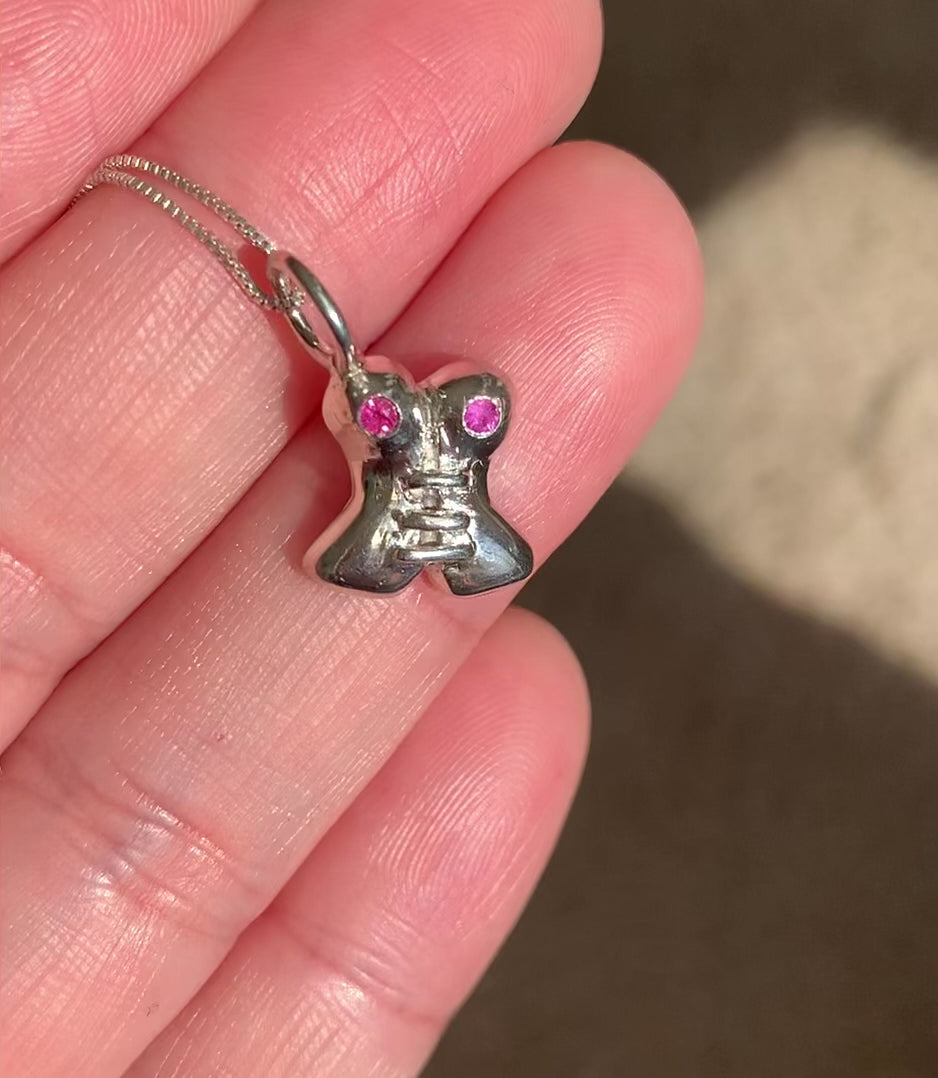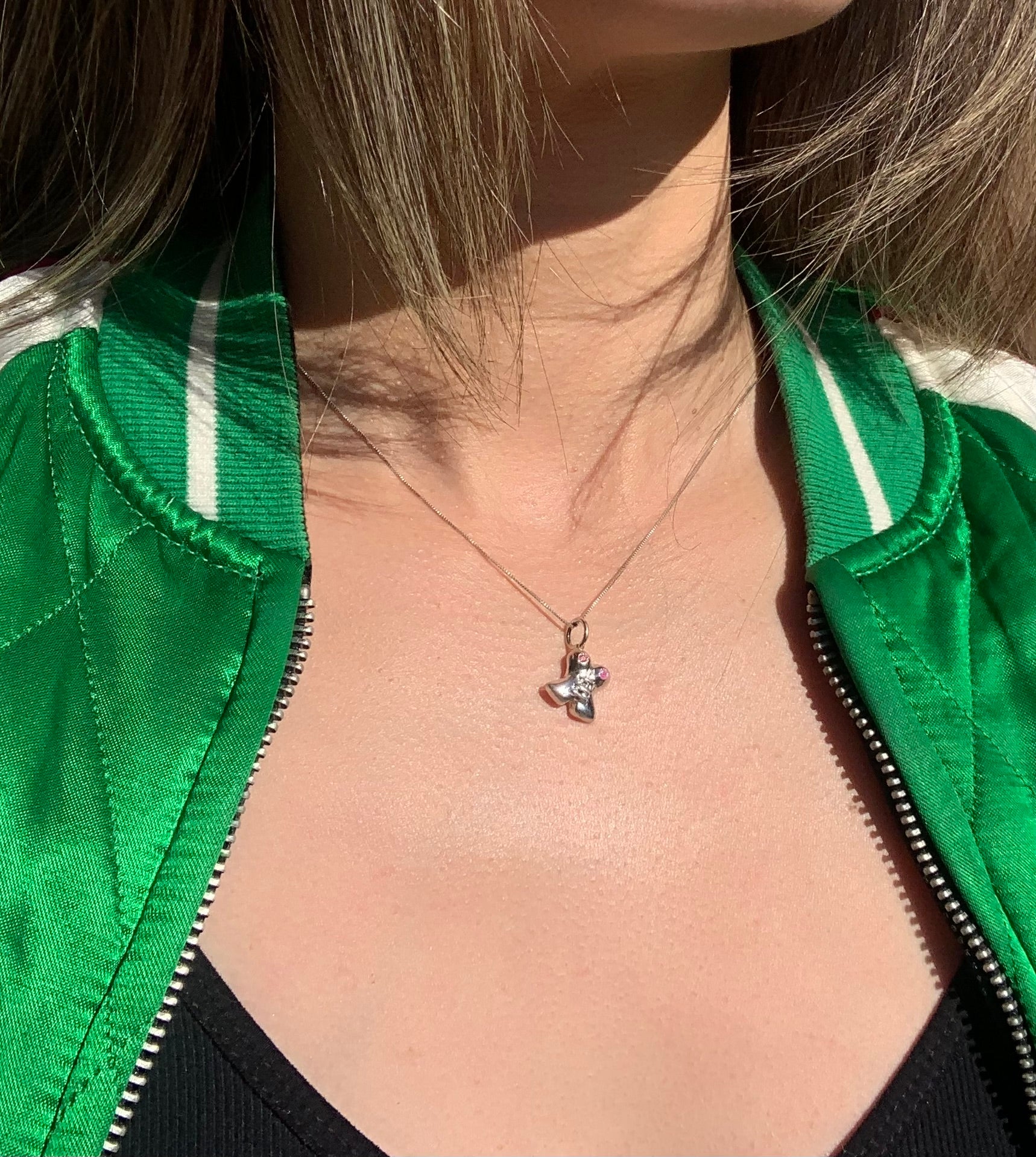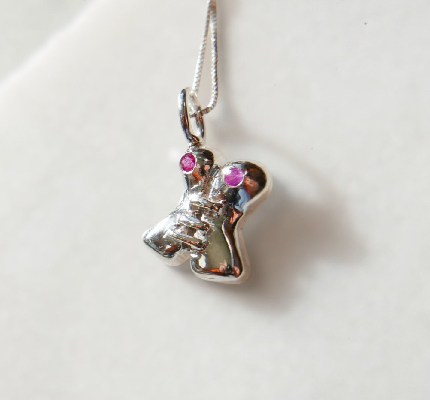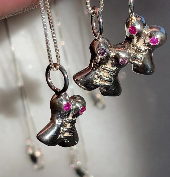Handcrafted bustier charm necklace with pink sapphires set in sterling silver.