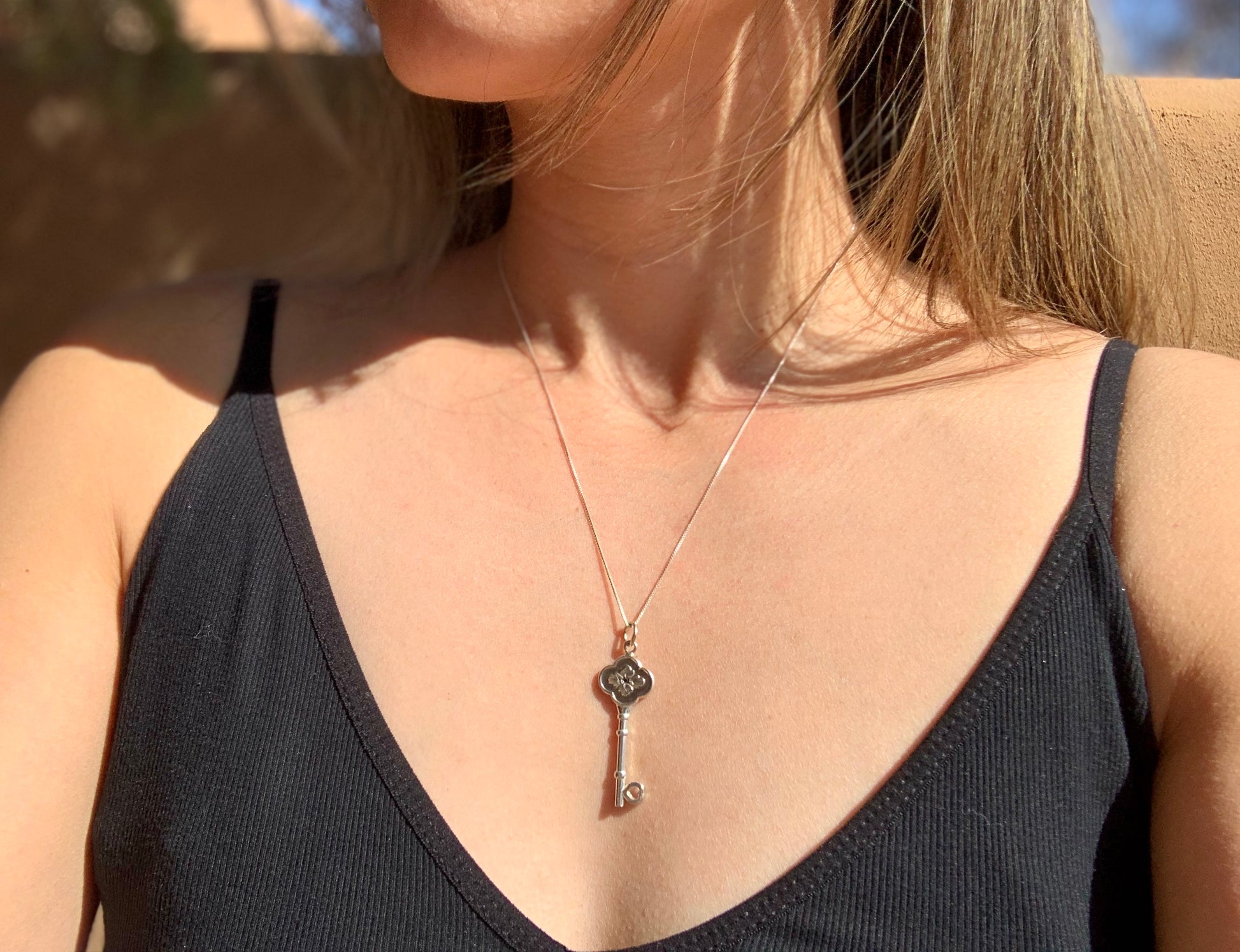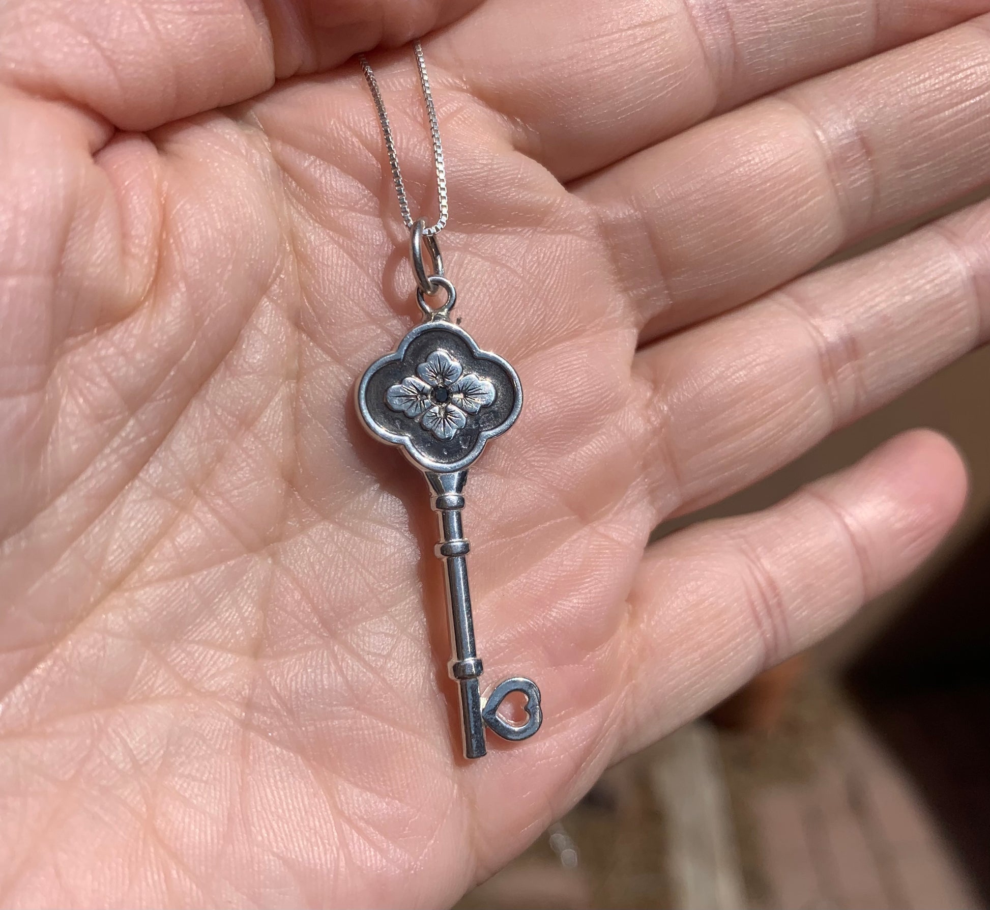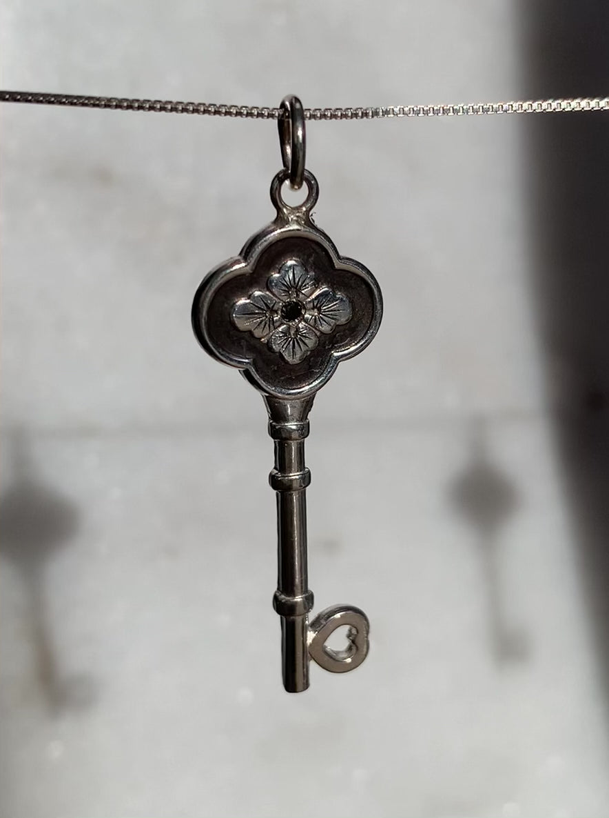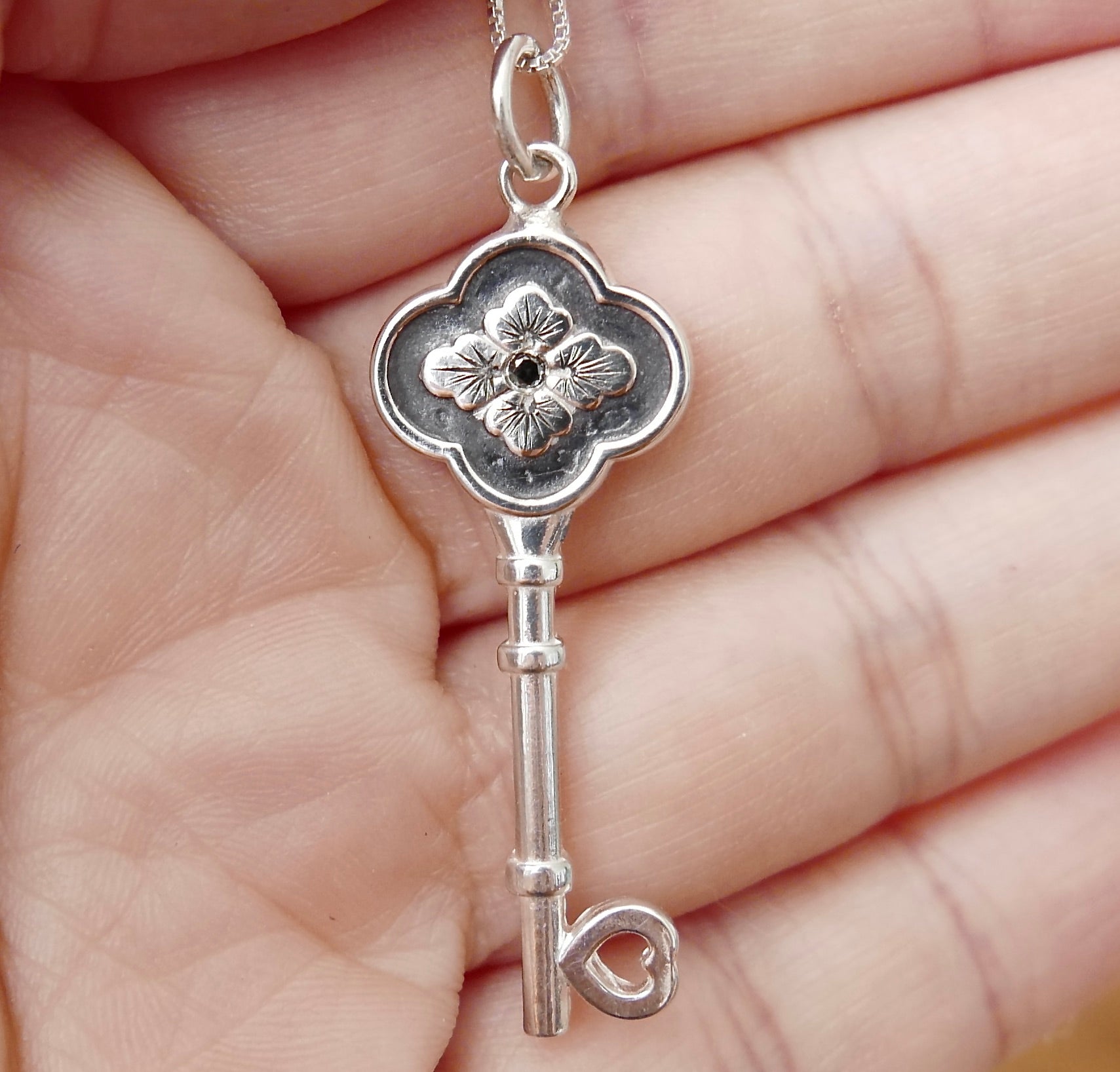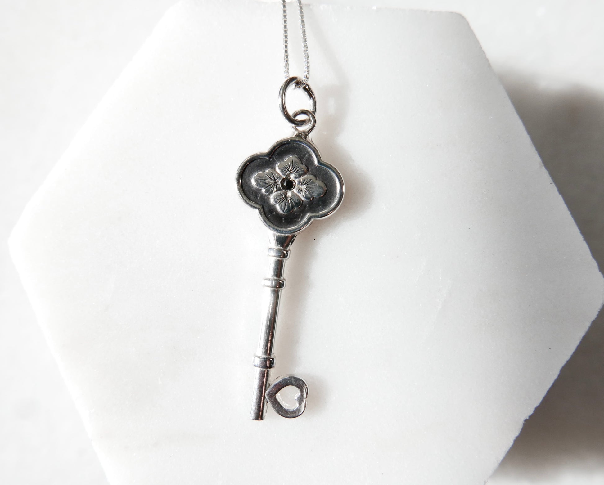 This Japanese Kamon crest key necklace features a black diamond set in the hand engraved key. The pendant length including the bail at the top is 1" 3/4. The pendant hangs from a 18" dainty box chain. The back of the pendant is stamped with my logo and sterling silver quality stamp (925)