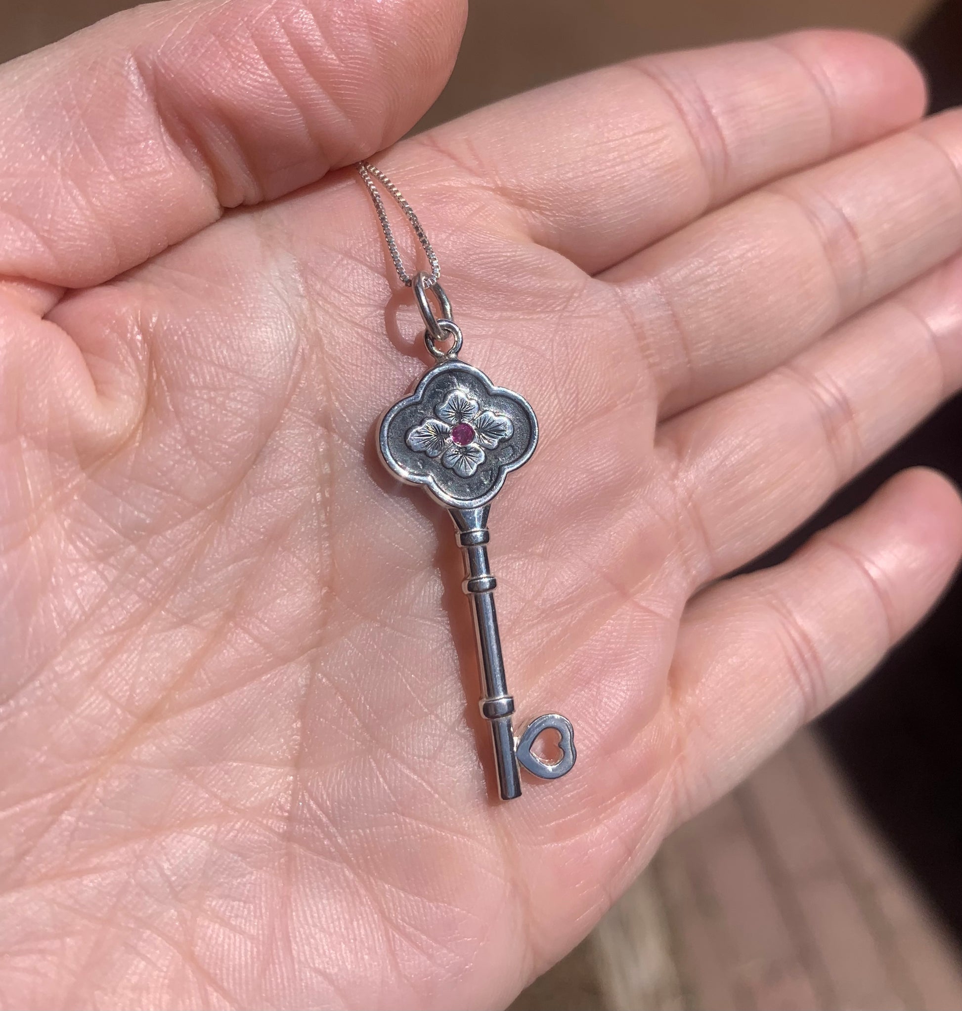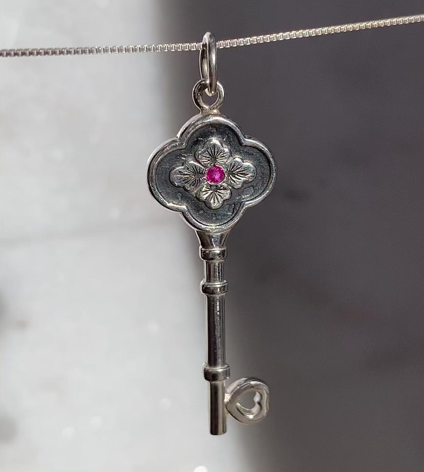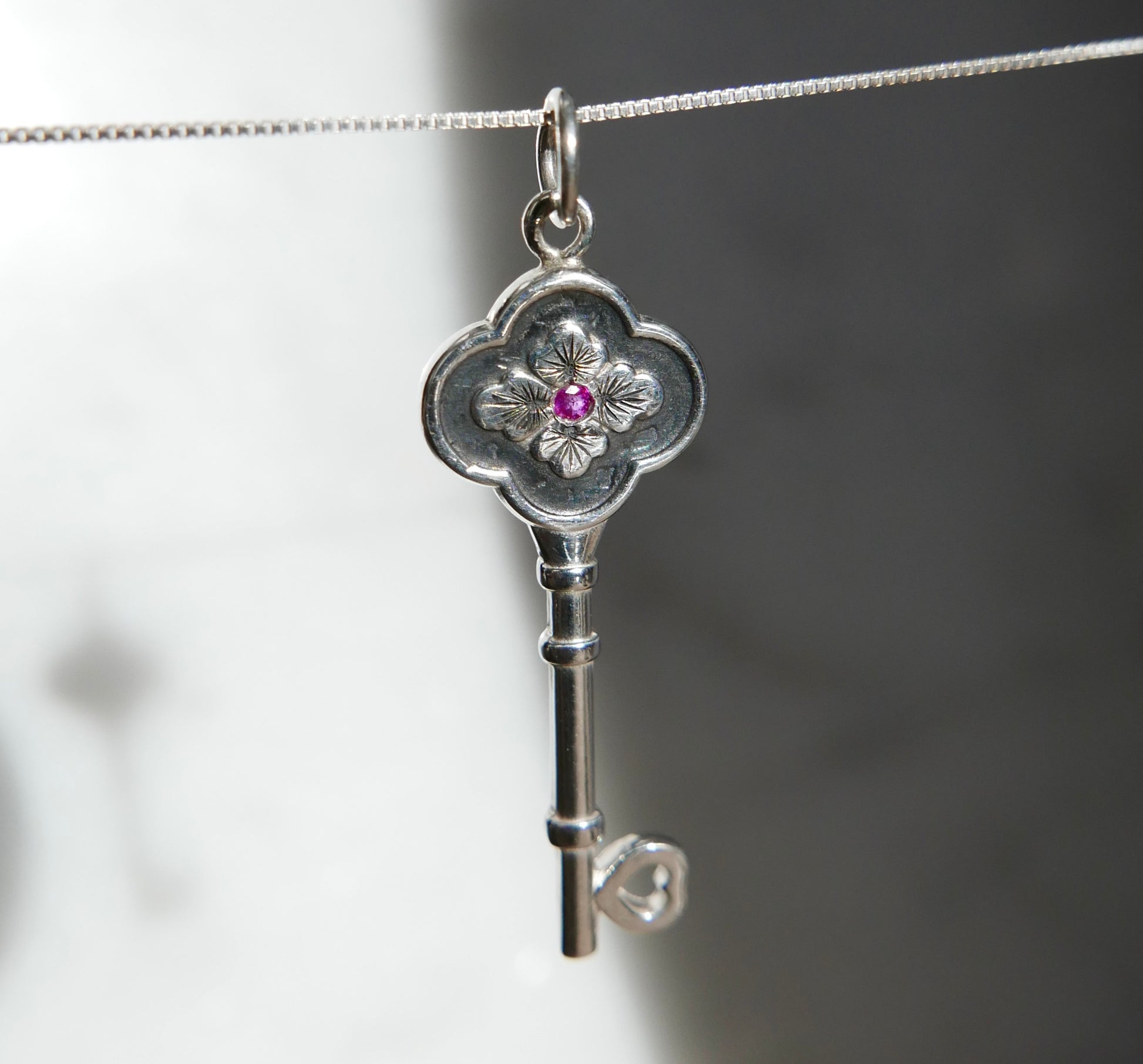 This Japanese Kamon crest key necklace features a pink sapphire set in the hand engraved key. The pendant length including the bail at the top is 1" 3/4. The pendant hangs from a 18" dainty box chain. The back of the pendant is stamped with my logo and sterling silver quality stamp (925)