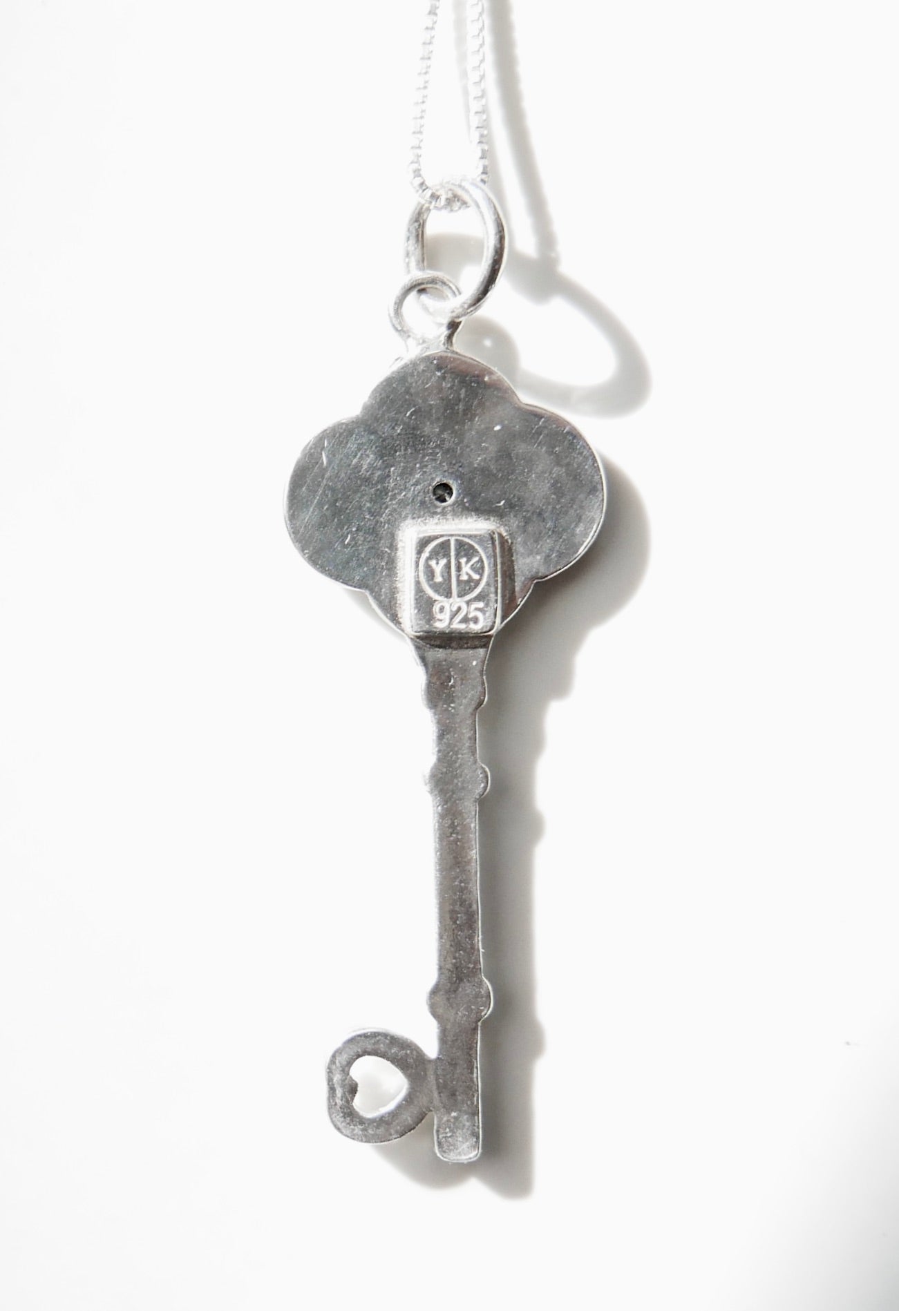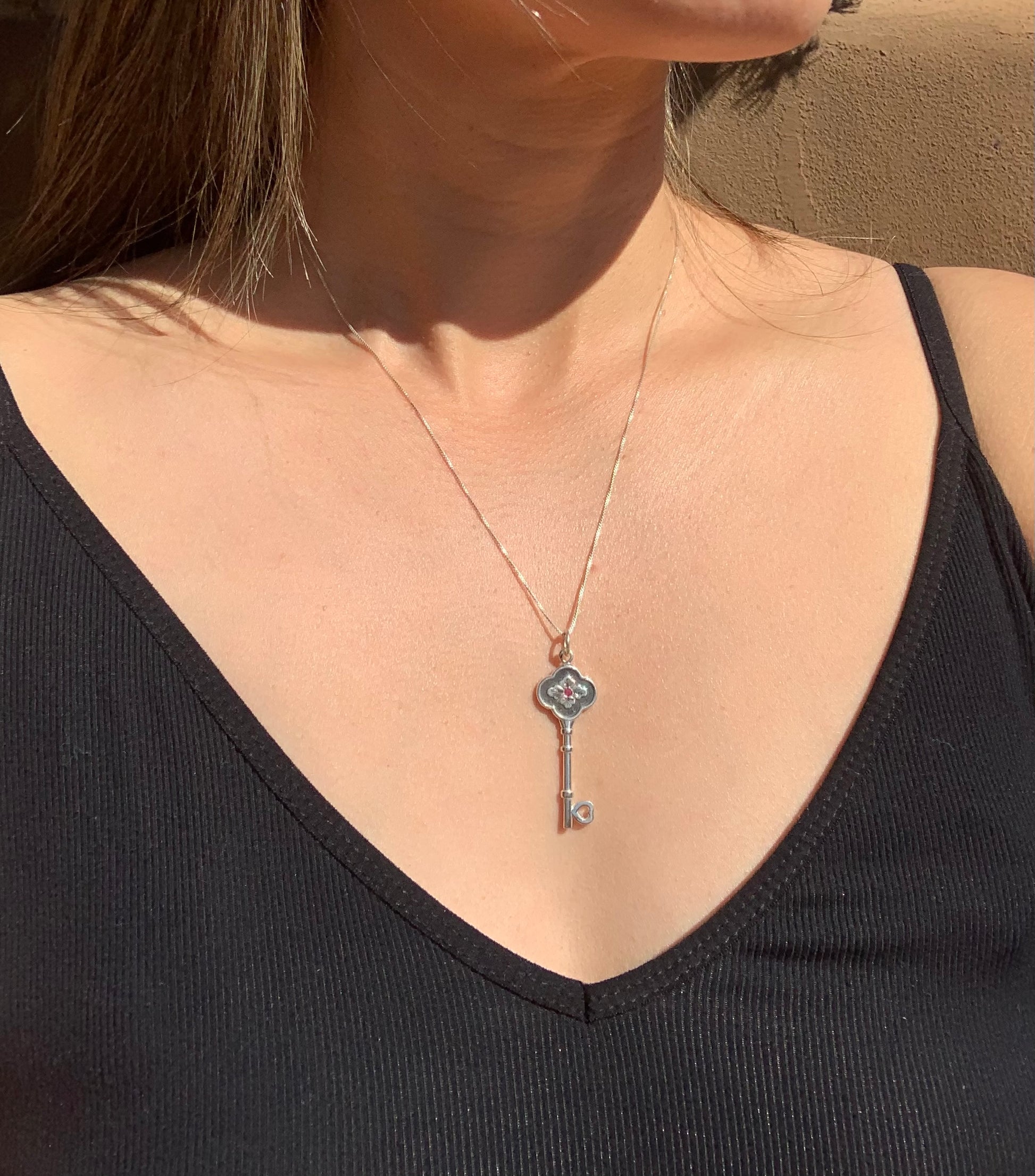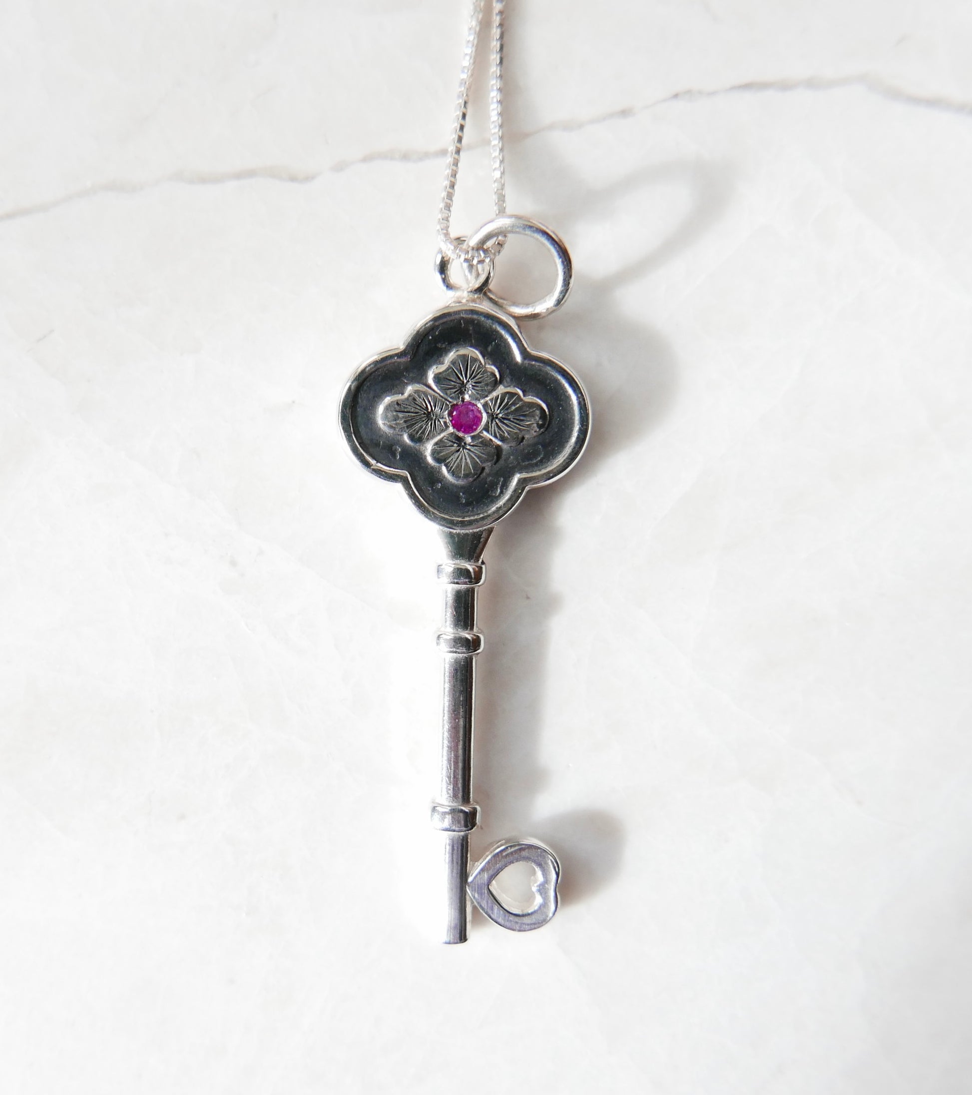 This Japanese Kamon crest key necklace features a pink sapphire set in the hand engraved key. The pendant length including the bail at the top is 1" 3/4. The pendant hangs from a 18" dainty box chain. The back of the pendant is stamped with my logo and sterling silver quality stamp (925)