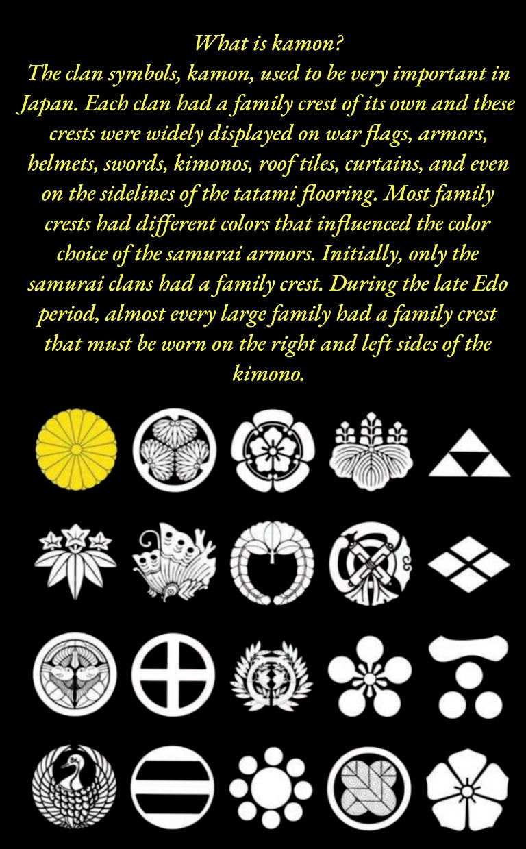 The clan symbols, kamon, used to be very important in Japan. Each clan had a family crest of its own and these crests were widely displayed on war flags, armors, helmets, swords, kimonos, roof tiles, curtains, and even on the sidelines of the tatami flooring. Most family crests had different colors that influenced the color choice of the samurai armors. Initially, only the samurai clans had a family crest. During the late Edo period, almost every large family had a family crest that must be worn on the right and left sides of the kimono.